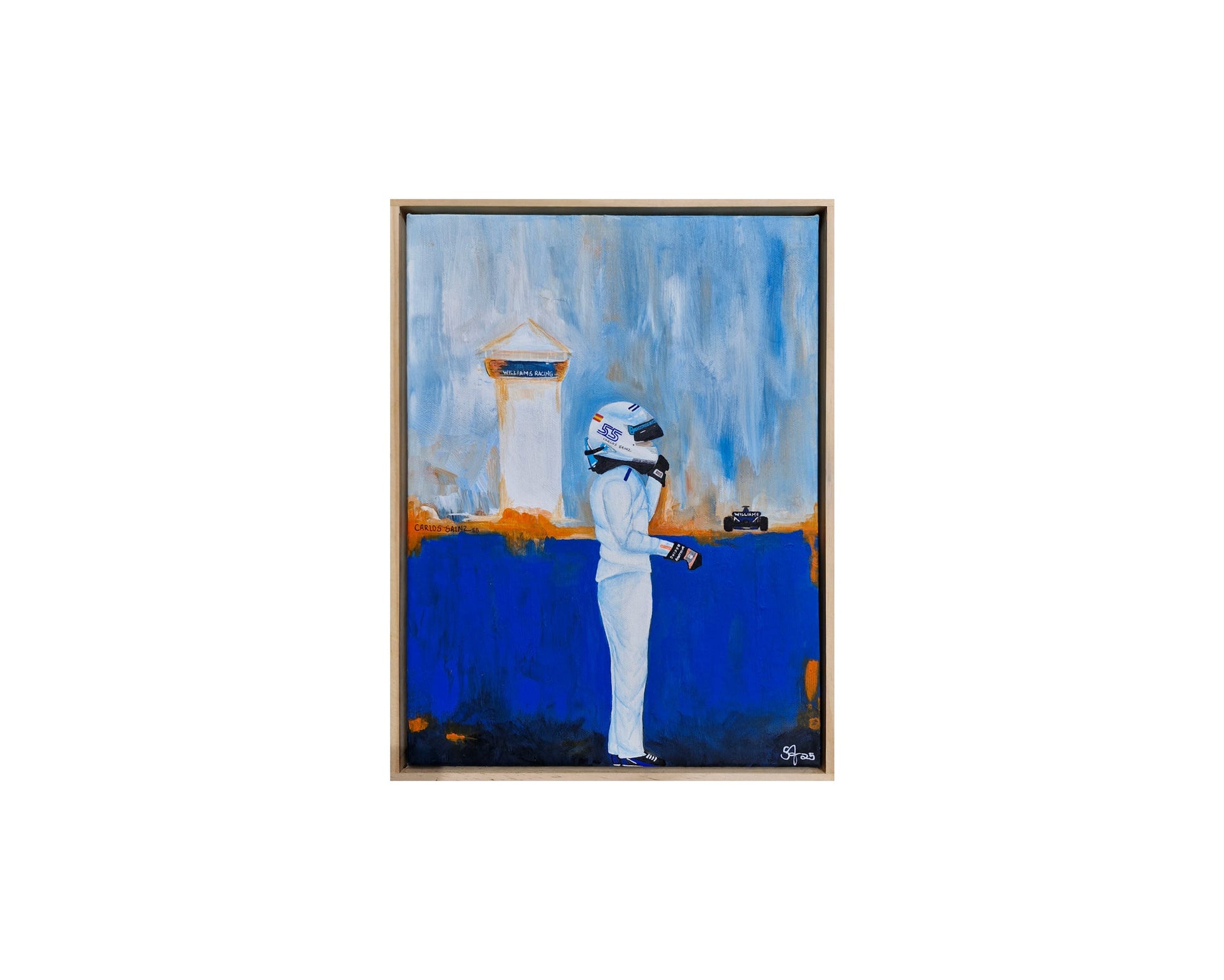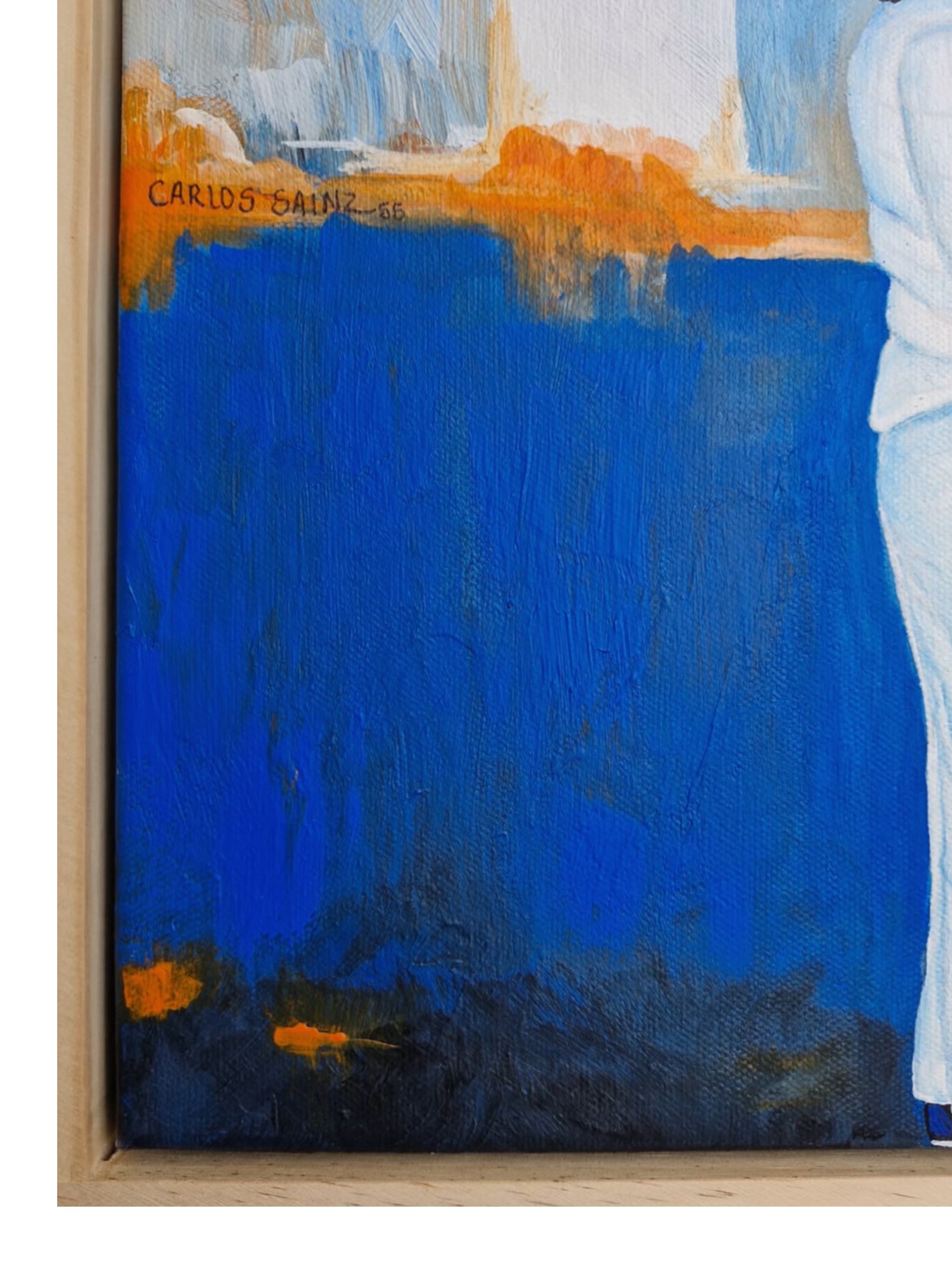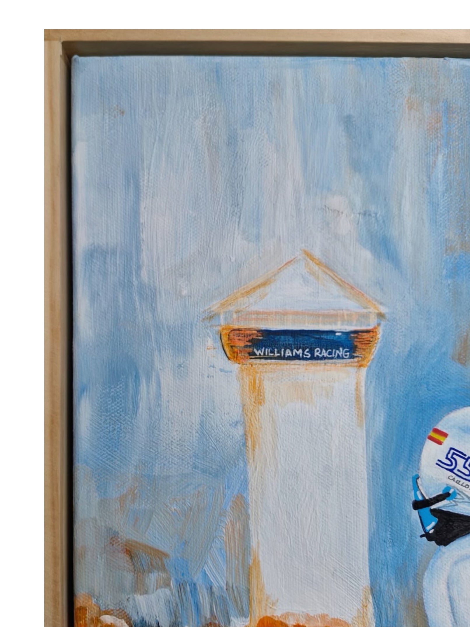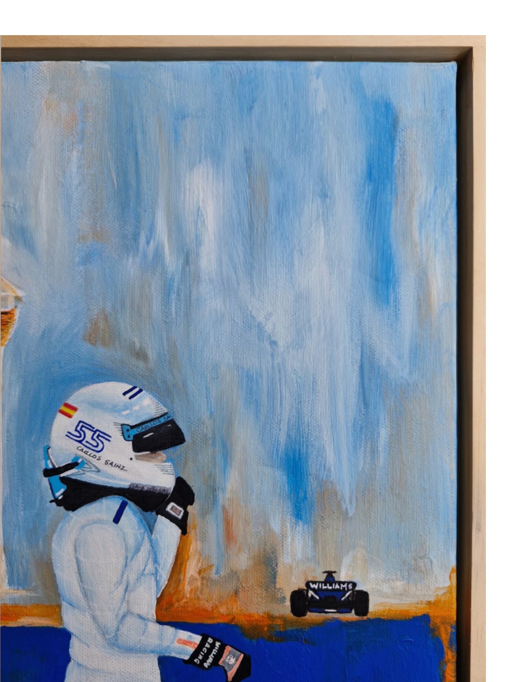 Original acrylic painting on canvas depicting Carlos Sainz standing in the foreground, with his F1 car in the distance. He is poised and confident, wearing his racing suit and helmet. The car captured in motion behind him, highlights the contrast between the calm focus of the driver and the dynamic energy of the race.